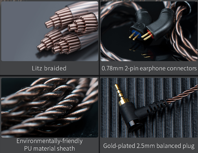 The cable is made of braided Litz wires. With each wire specifically chosen and insulated from each other, it ensures better audio transmission performance unser the naturally-occurring yet adverse “skin” and “proximity” effect.