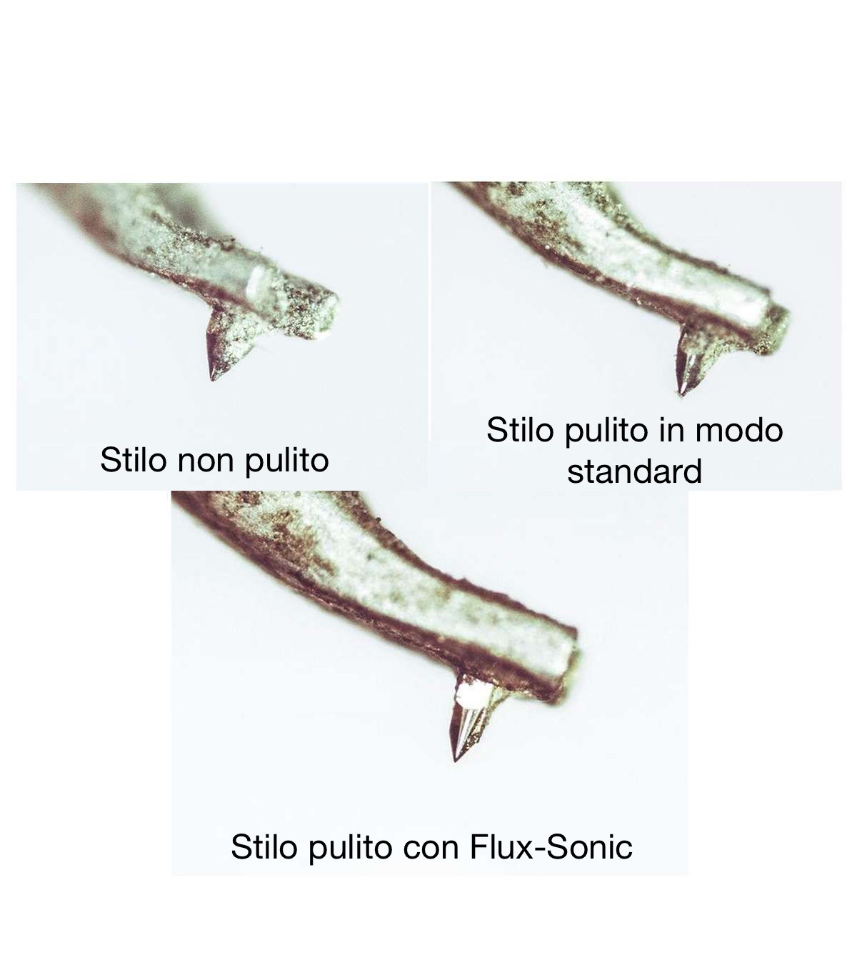 The stylus is the primary component in the playback process. The motion, which will later induce voltage, is created here. The aim is to accurately track the groove in the micrometer range. The manufacturers of pickups undertake substantial efforts to achieve this goal perfectly. However, if the needle is dirty, the diamond - no matter how ground and polished it is - cannot exactly follow the deflection. It reacts too early or too late, and this leads to distortions. Even supposedly clean records are covered with dust, partly visible, partly invisible in the groove. This includes particles of silicates, polymers and organic materials. These adhere to the needle during the scanning process, due to the high temperature. This happens very quickly, after playing one record side, the needle is hardly visible due to dirt.