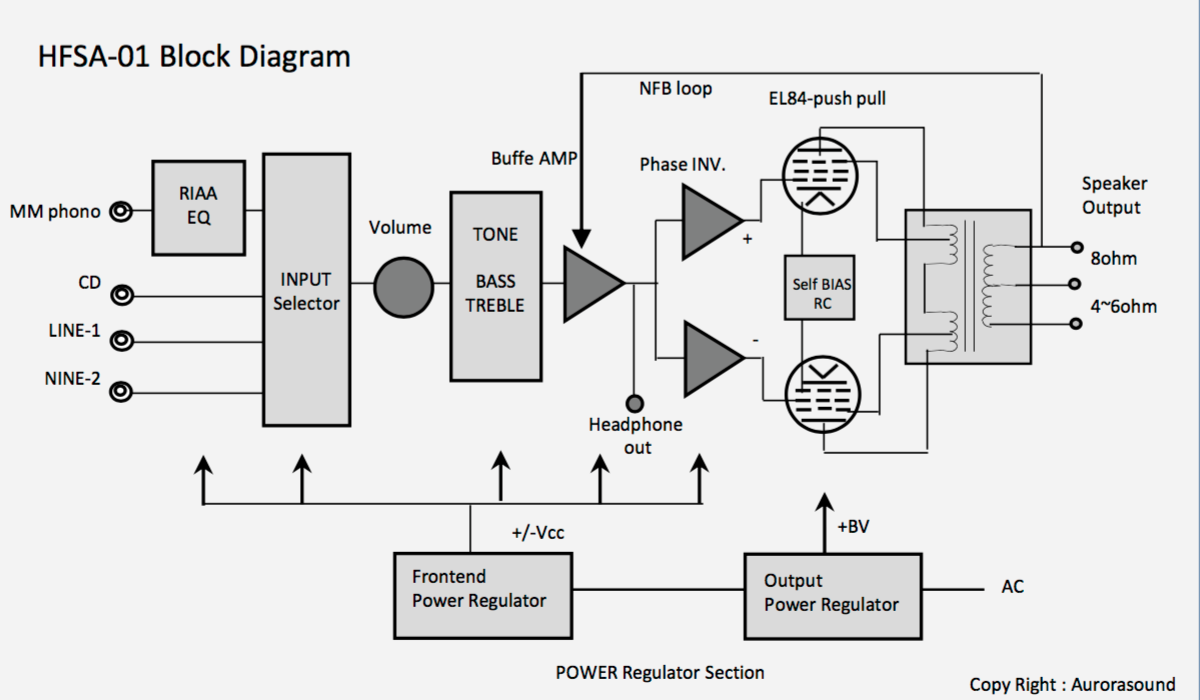 The output transformer and power supply transformer are custom designed by Aurorasound, and manufactured by a Japanese company. This model employs carefully selected high-quality capacitors and resisters, as well.