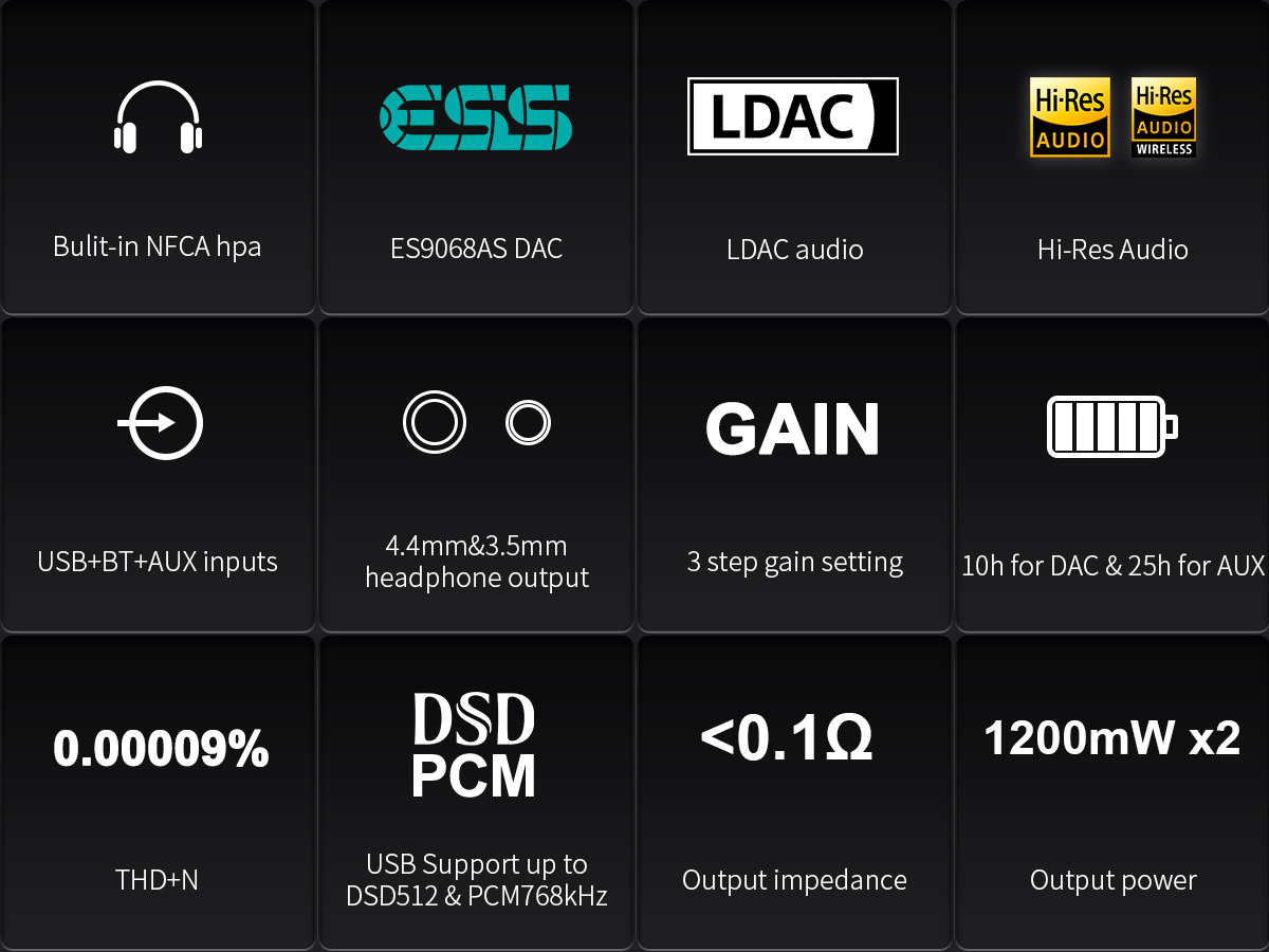 Topping G5 uses an NFCA module specifically modified for portable devices, allowing to maintain low distortion and good battery life. It provides a 3 step gain control, so that it can pair both with sensitive IEMs and high-impedance headphones.