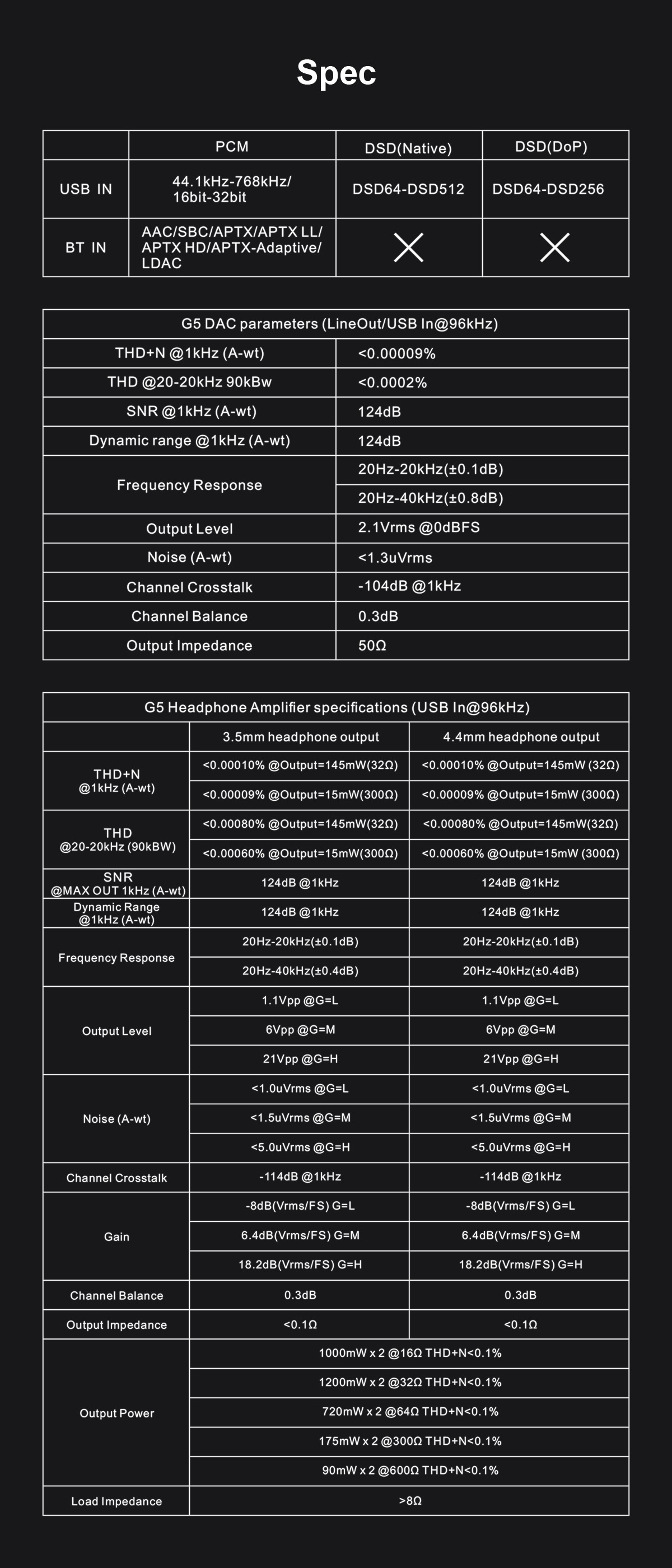 Topping G5 has the certification of Hi-Res Audio Wireless and LDAC. It uses QCC5125 chipset to support LDAC/AAC/SBC/aptX/aptX LL/aptX HD/aptX Adaptive Protocol. To get even better sound quality from Bluetooth, the Topping G5 connects its digital signal to ESS ES9068AS DAC chip to achieve excellent performance in a portable size.