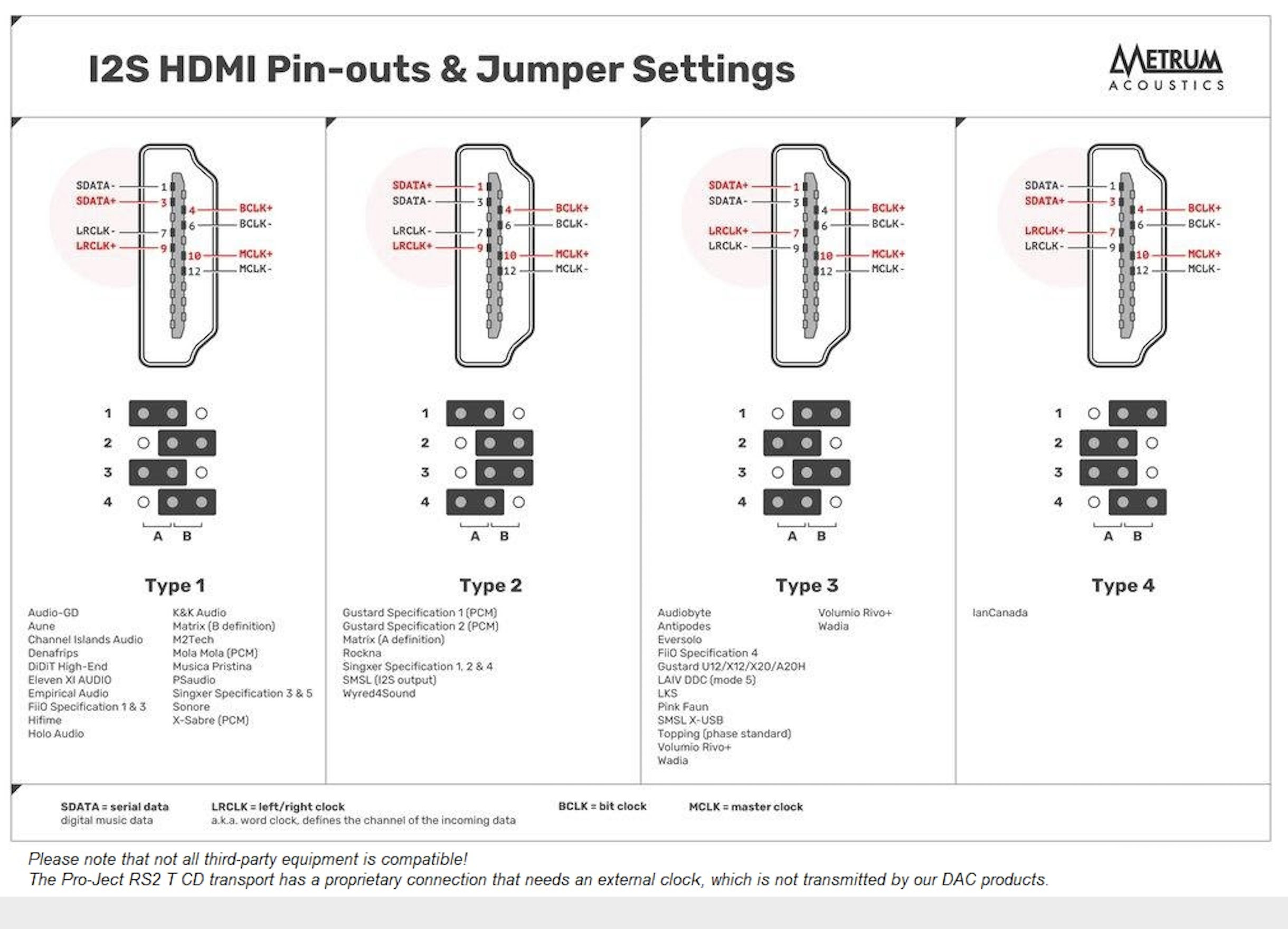 - Type 2: Gustard Specification 1 (PCM), Gustard Specification 2 (PCM), Matrix (A definition), Rickna, Singxer (Specification 1,2 & 4), SMSL (12S output), Wyred4Sound