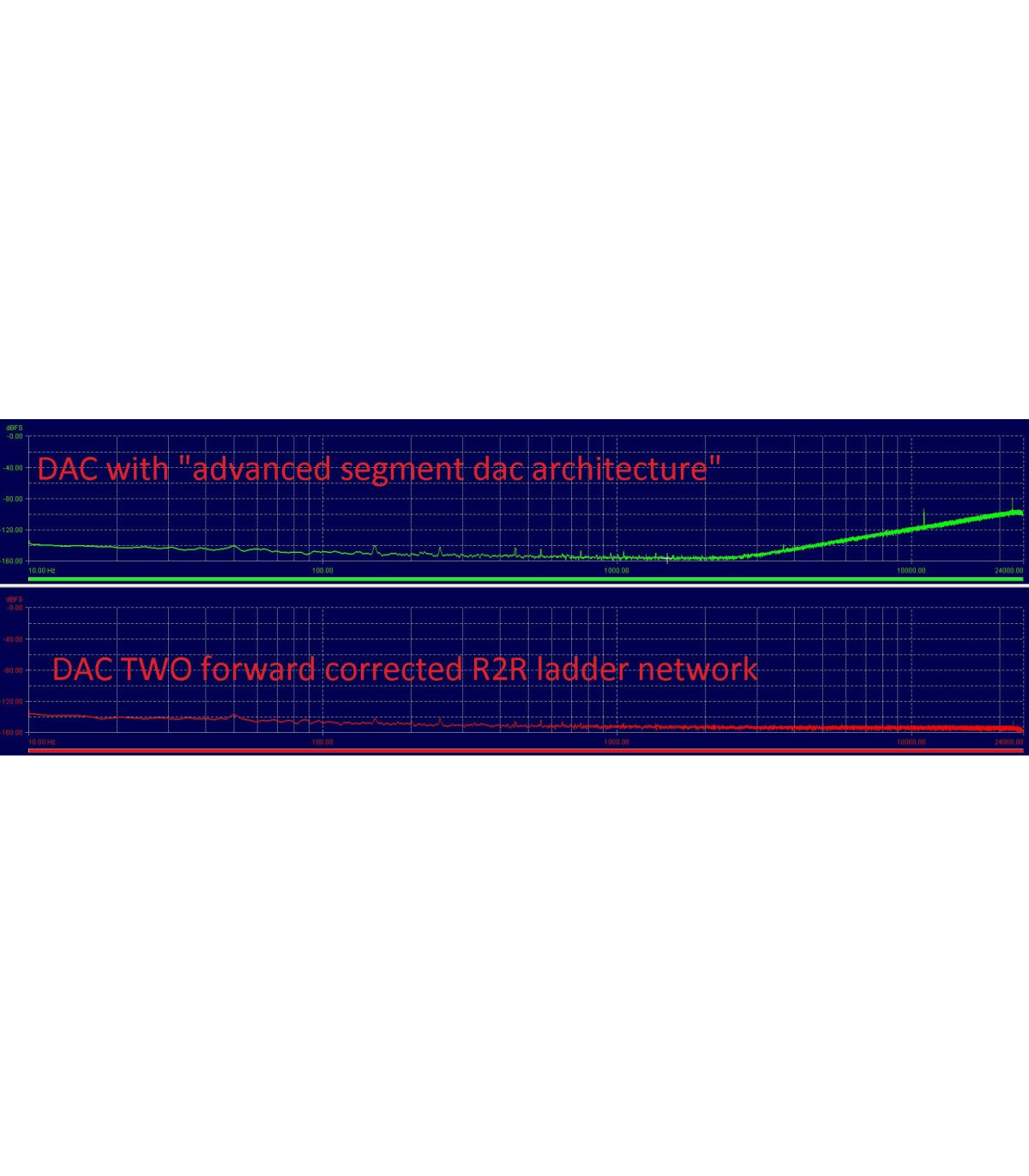 High resolution linearity plot of DAC TWO (please see image "1000 step linearity plot DAC TWO module"). The analyzer is struggling to show us the last bits down to -140 dB. In case more bits are involved the steps are shrinking and more resolution is available. This extreme linearity is realized by our forward correction techniques and improves reproduction of the lowest musical details.