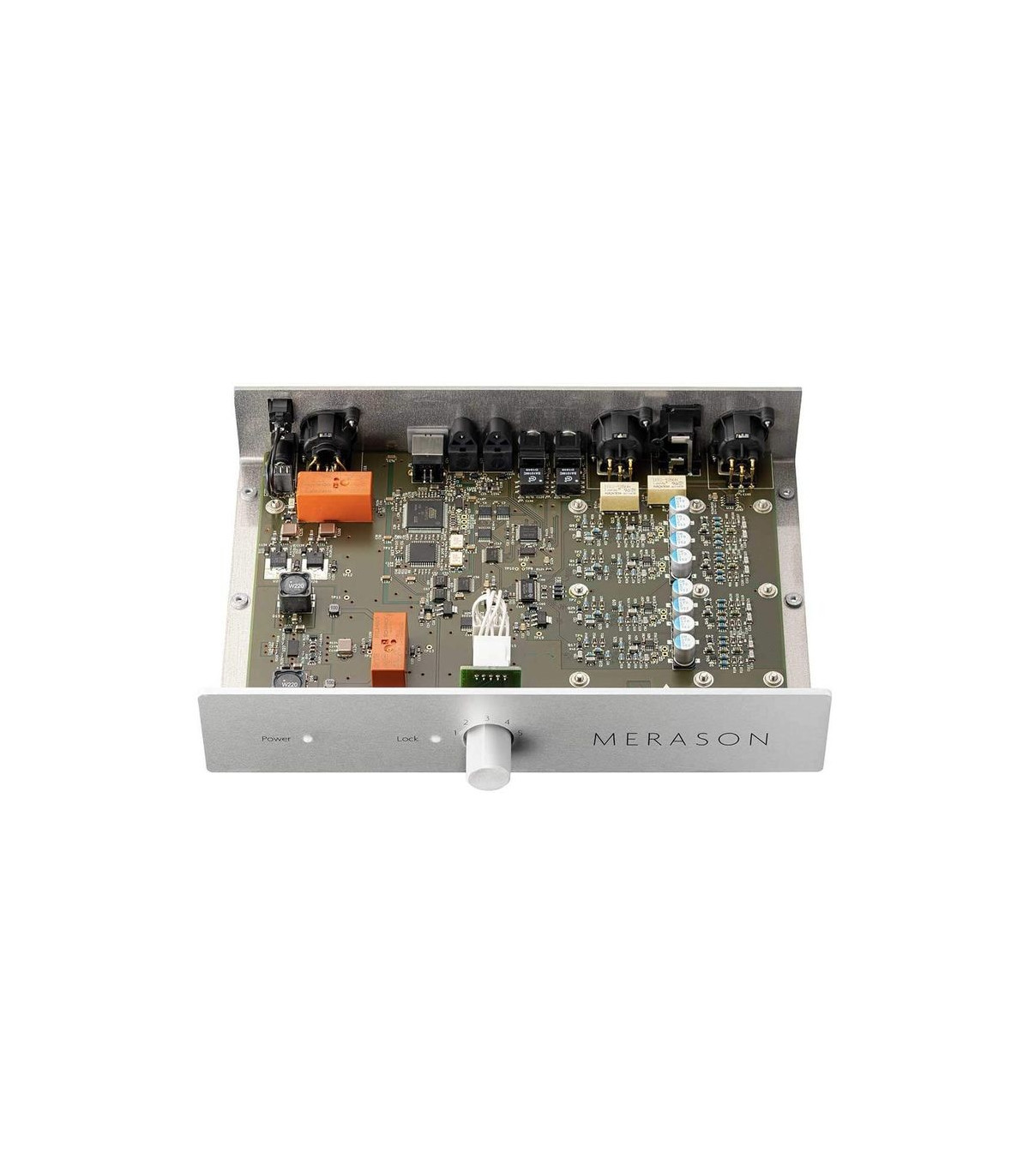 Peering inside the Frerot, it becomes obvious that Merason pays a lot of attention in managing the digital signal. The electrically incoming digital signals are all initially galvanically isolated. With the isolation of the coaxial input via transformer and with the capacitive isolation of the USB input. The signals are then converted to I²S format using an AK4118 chip and sent to the 1794A DAC. Post DAC conversion of current to voltage is handled with discrete components and a Class A buffer. Voltage regulation is handled via proprietary circuitry.
