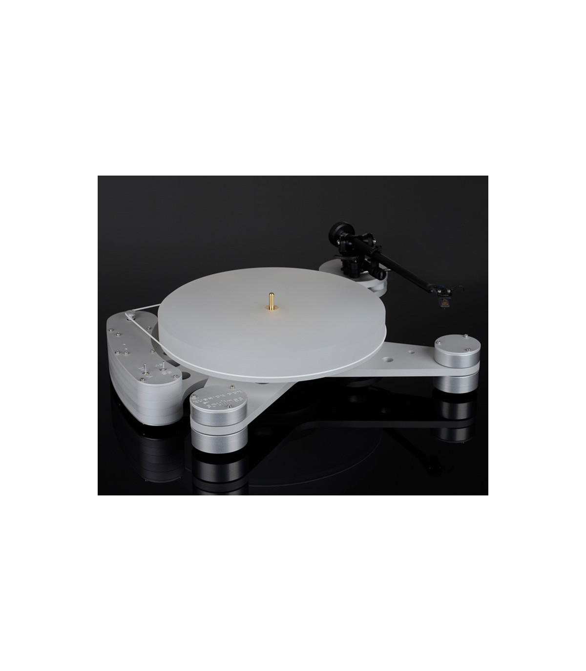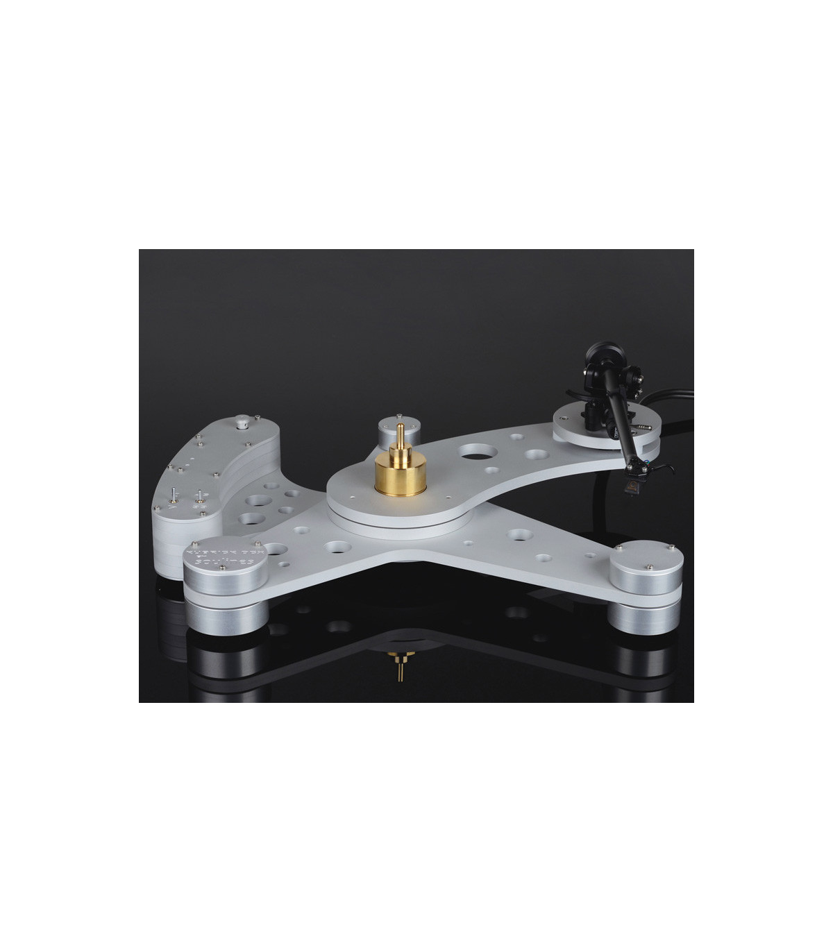 Inverted main bearing, machined from solid brass and stainless steel to extremely high precision, and solid aluminum arm-board are mounted directly on the sub plinth which is in turn 3-point coupled to the main plinth in order to maximize performance and minimize acoustic break through. The motor assembly is mounted on the main plinth.