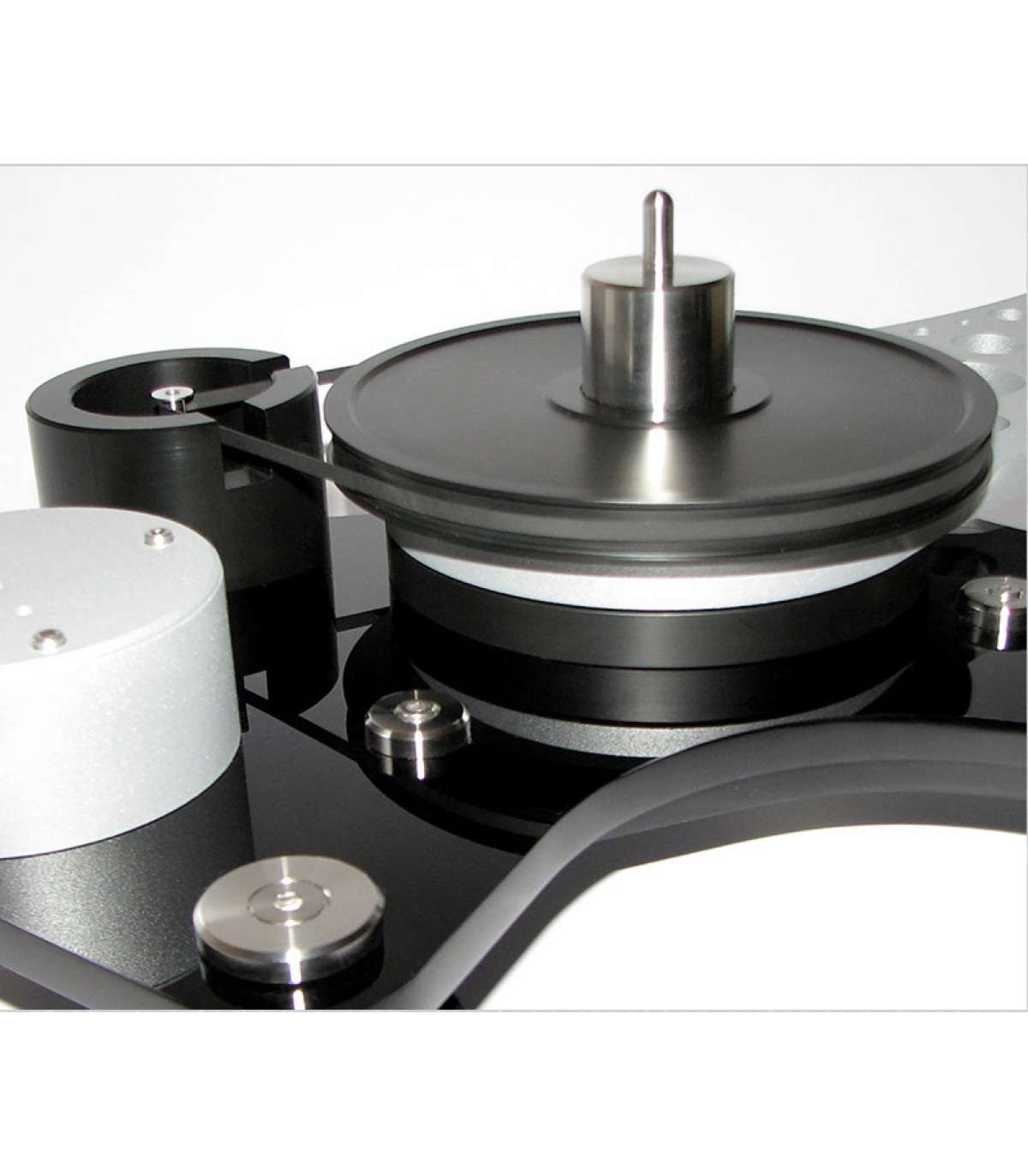 The aluminum arm-board and main bearing are mounted directly to the aluminum sub-plinth, which is 3-point coupled to the main plinth made of cast Acrylic and Derlin via rubber-cork washers of different diameters and thicknesses. This design maximizes performance while minimizing acoustic breakthrough. The motor assembly, machined from Derlin, is rigidly fixed to the main plinth.