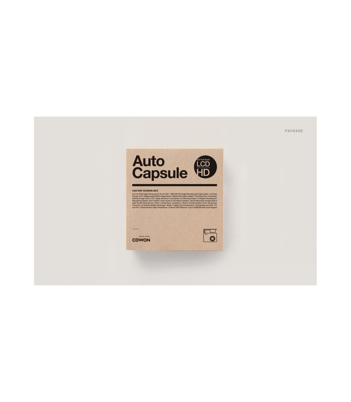 - Package components: Auto Capsule AE1, Product Holder, Cigar Jack, MicroSD Cars, MicroSD Card Reader, Manual & PC Viewer CD, Quick Guide, Double-coated Tape.