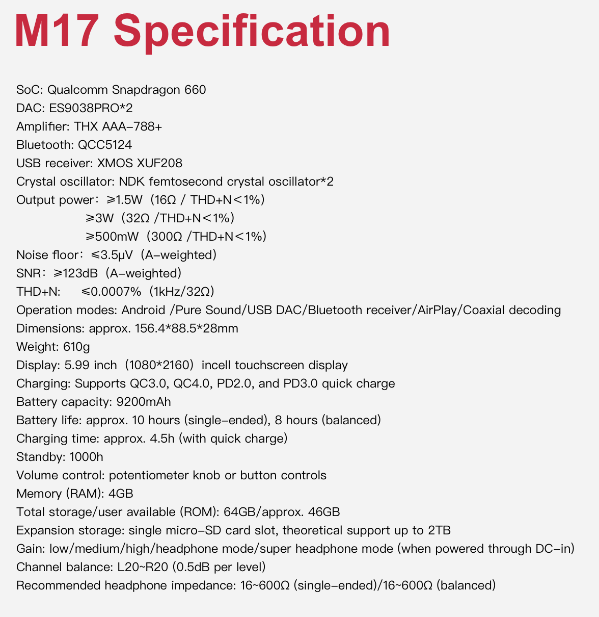 The smart desktop-class M17 is an entirely new chapter of FiiO digital audio players. It's desktop-grade DAC, amplification, power supply, etc. give it the output power and sound quality to rival and perhaps even surpass highly-regarded desktop systems, but in a portable package. Let the M17 redefine what is possible with portable audio players.