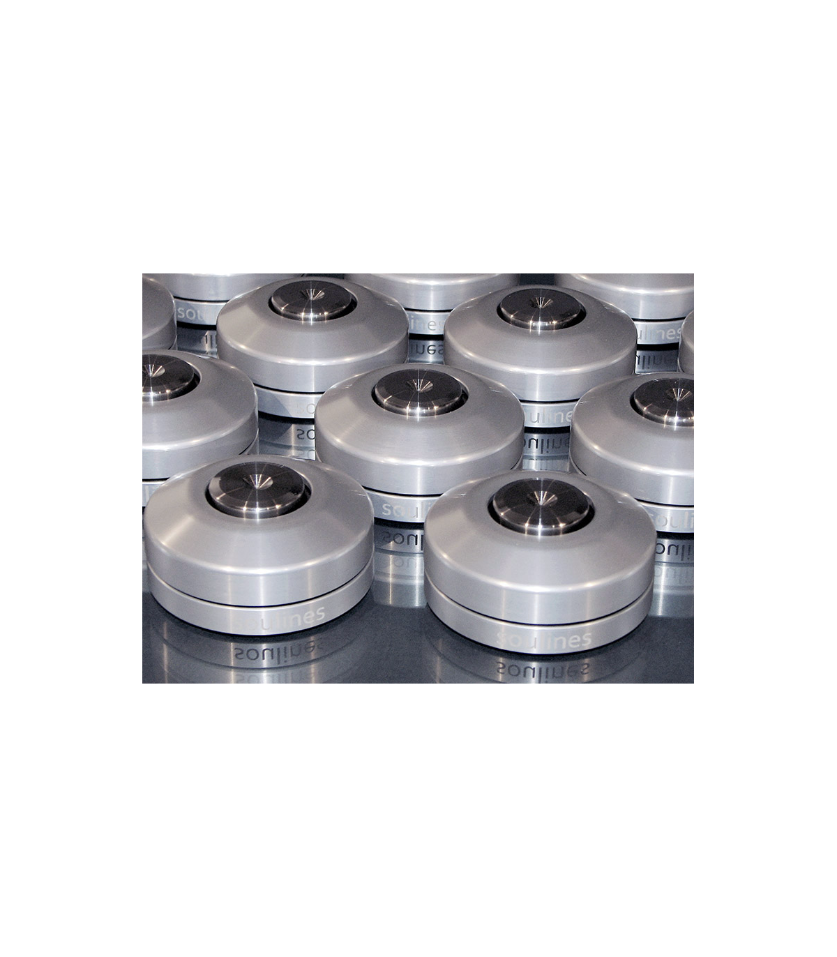 The bbs feet, designed with ball-bearing swing mechanisms, serve as resonance-damping devices developed by Soulines to mitigate sound interference. These are intended for a wide range of audio equipment, including turntables, CD/DVD transports and players, DACs, audio streamers and servers, phono and line preamplifiers (both tube and solid-state), integrated amplifiers, power amplifiers, and speakers, within specified weight limits.