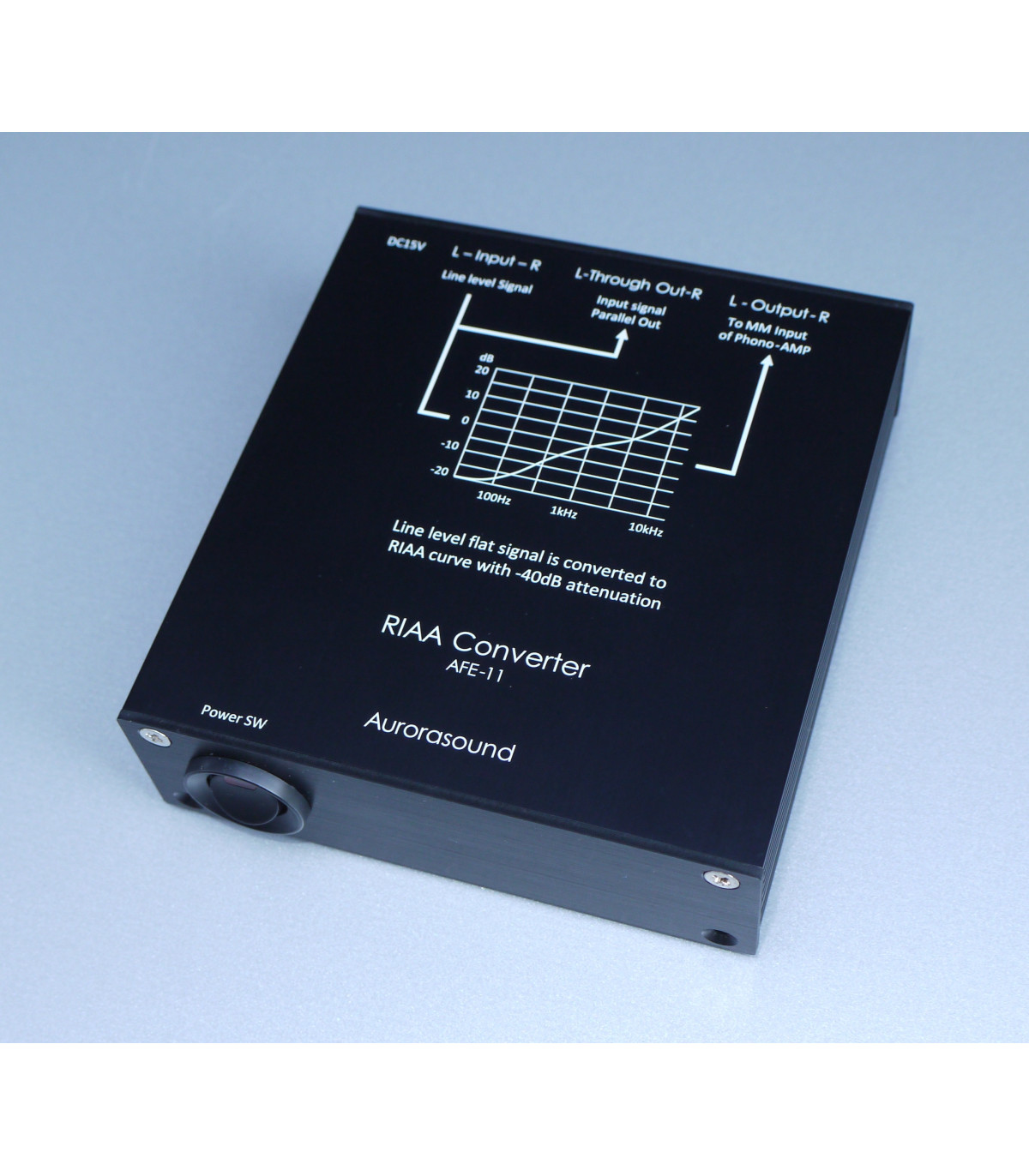 The RIAA Converter AFE-11 converts an output signal of CD player or DA converter to RIAA recording curve of vinyl disks.