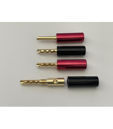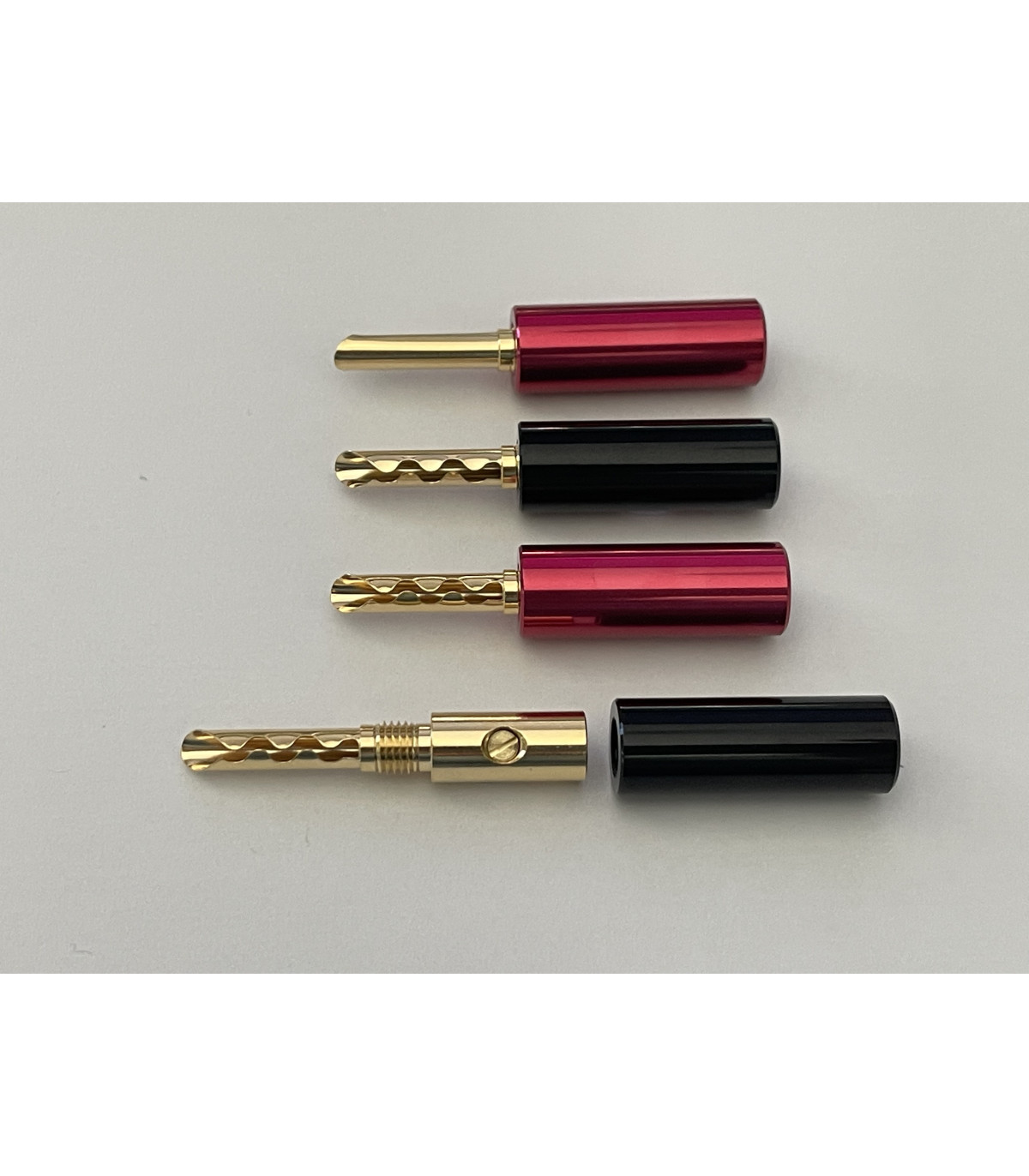 Set di 4 Banana Connector microholed pin 24k Gold Plated, 24k Gold-plated Brass Body, metal anodized external body, double screw fixing cable, high contact surface. Low electric resistance. Maximum diameter of cable hole: 4.6mm.