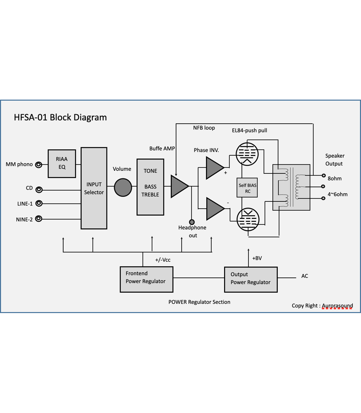 HFSA-01 è un amplificatore ibrido che sfrutta i vantaggi sia delle valvole che dei semiconduttori. Una coppia per canale di valvole EL84 eroga 14W + 14W di potenza in uscita. Il "magico" circuito di preamplificazione per cui Aurorasound è famosa è impiegato nello stadio di ingresso. Il modello è dotato di speciali controlli dei bassi e degli acuti attentamente tarati per ottimizzare finemente qualsiasi incisione o diffusore acustico. Gli ingressi comprendono uno stadio di equalizzazione Phono adatto a testine MM e altri ingressi di linea RCA.