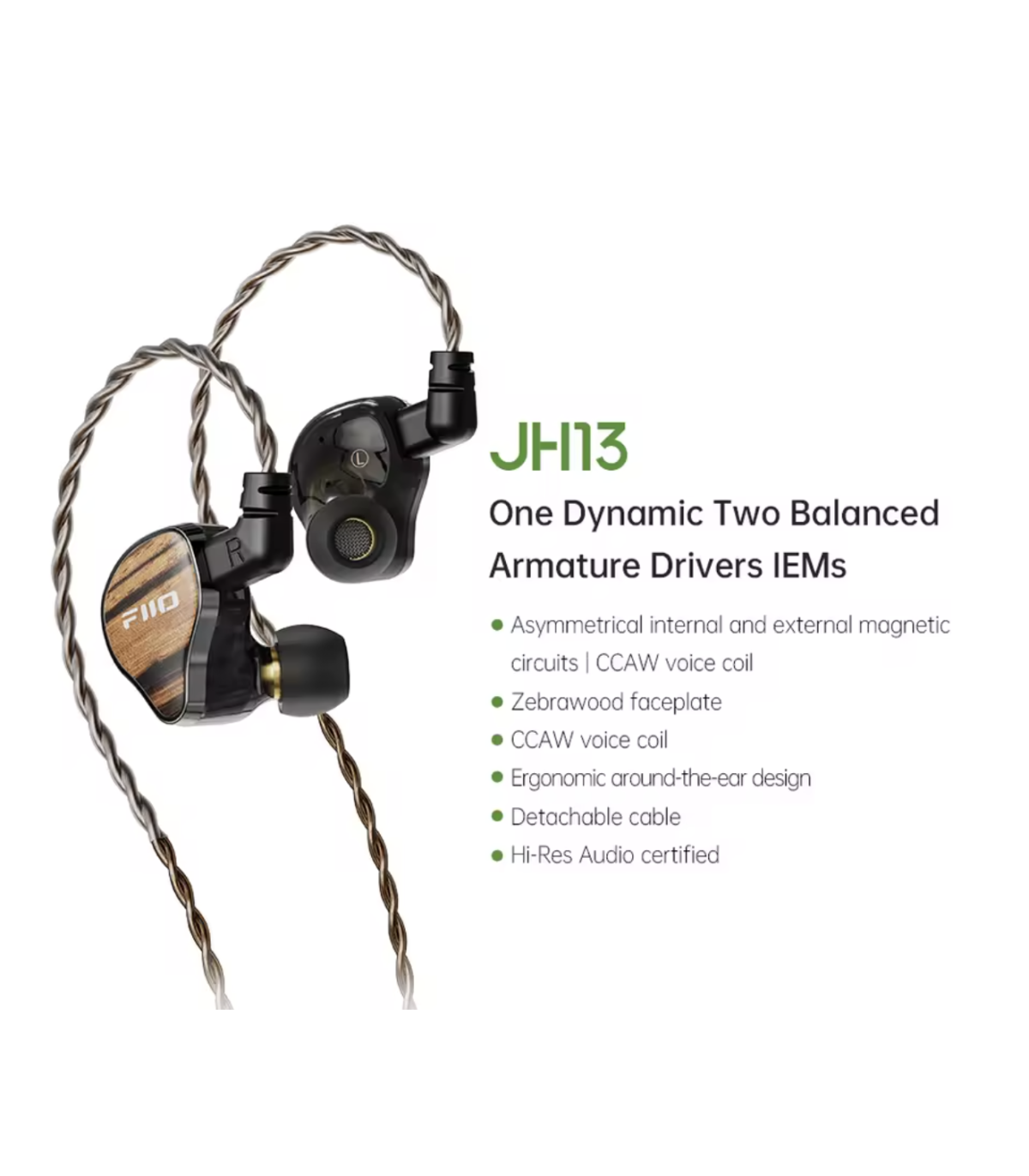 I monitor auricolari ibridi FiiO JH13 combinano un approccio tecnico avanzato con un design ricercato, offrendo un’esperienza sonora completa e versatile. Il loro sistema ibrido a tre driver integra un’unità dinamica da 10 mm, responsabile di bassi profondi e controllati, e due driver a armatura bilanciata, dedicati alla riproduzione delle alte frequenze con grande chiarezza e dettaglio. Grazie a un crossover accuratamente ottimizzato, il passaggio tra le diverse gamme risulta fluido, restituendo un suono neutro, definito e adatto a molti generi musicali.