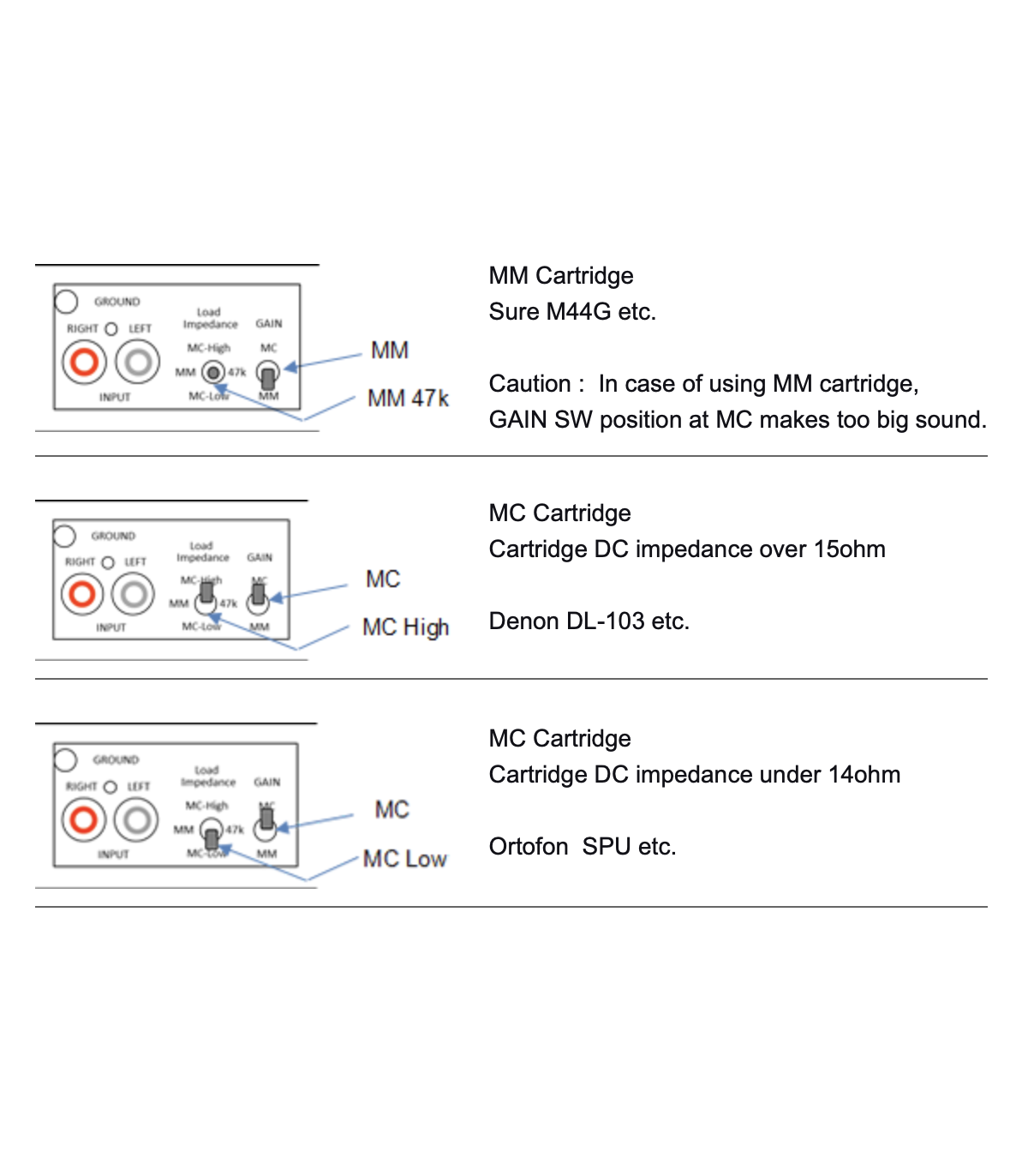 Impedenza di carico per la testina: 47kΩ/MM, MC-high, MC-low